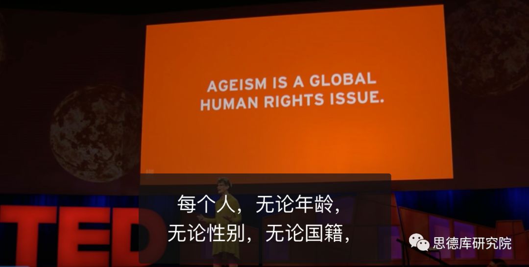这句话来自社会活动家阿什顿•阿普尔怀特(Ashton Applewhite)在TED中的演讲,她是《颤抖的座椅:向老龄化歧视大声说“不”!》(This Chair Rocks: A Manifesto Against Ageism)的作者,这本书解释了历史上年龄歧视产生的根源,以及它是如何划分的,抨击了年龄削弱人体大脑和身体机能的陈腔滥调,批评了老年人作为社会负担的不实言论,展望了未来全年龄友好型(all-age-friendly)社会的模样。