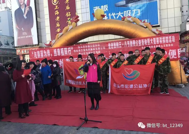 在3.8国际妇女节到来之际,包头市12349便民为老呼叫服务中心后台加盟商包头市宏德公益协会携手包头市12349便民为老呼叫服务中心、固阳残联、固阳县残疾人互助协会、包头市兰宝毛织服装有限公司、青山区光荣社区党委、在固阳县天河广场开展3.8妇女节助残服装捐赠公益活动。3.8妇女节是世界的传统妇女节日,也是广大残疾妇女的节日,为使固阳县的残疾妇女及困难家庭感受到国家和社会各阶层的关爱, 为了使固阳县残疾妇女们过上一个祥和快乐的节日,让其体现出独立、自信美丽的一面,同时促进固阳人民和谐有爱的大家庭氛围,极大的丰富了固阳县人民的业余精神文化生活,特举办此次关爱女性奉献爱心的公益捐赠活动。