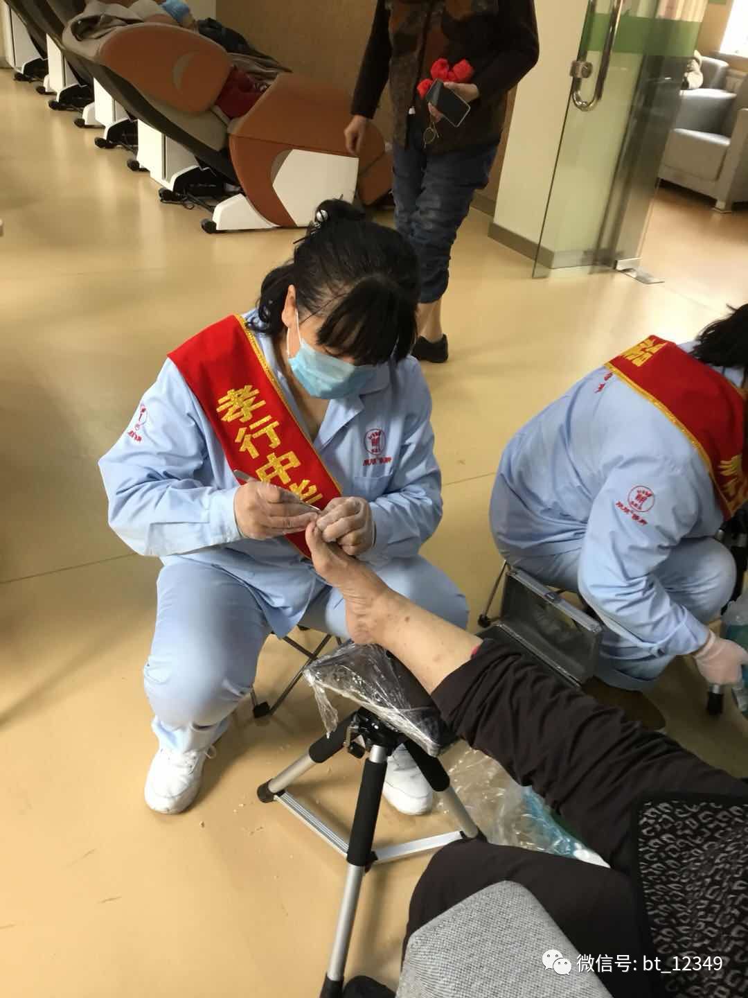 包头市12349便民为老呼叫服务中心在钢32#i吾之家智慧养老社区中心联合12349后台加盟商昆区朋朋休闲按摩服务店为老人修脚。