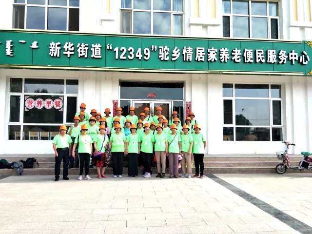6月20日,一群身穿绿T恤、头戴橙色帽的老年人在阿盟“12349”驼乡情便民为老服务中心文化小广场上有说有笑,期待着自己的旅行。