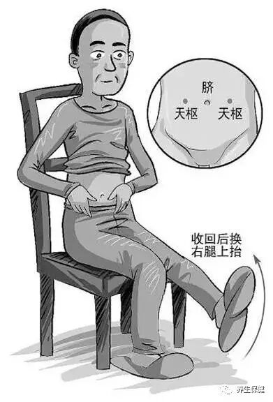 天枢穴位于肚脐旁2寸处,为左右对称两穴。它主疏调肠腑、理气行滞、消食,是腹部要穴。两腿并拢坐在椅子上,按压天枢穴,左腿尽量向上抬,然后收回,换右腿上抬、收回为1次,反复做5次。在大便时,可以用左手中指点压左侧天枢穴,至有酸胀感时按住不动,坚持一分钟左右即有便意,然后屏气增加腹内压力即可排便。