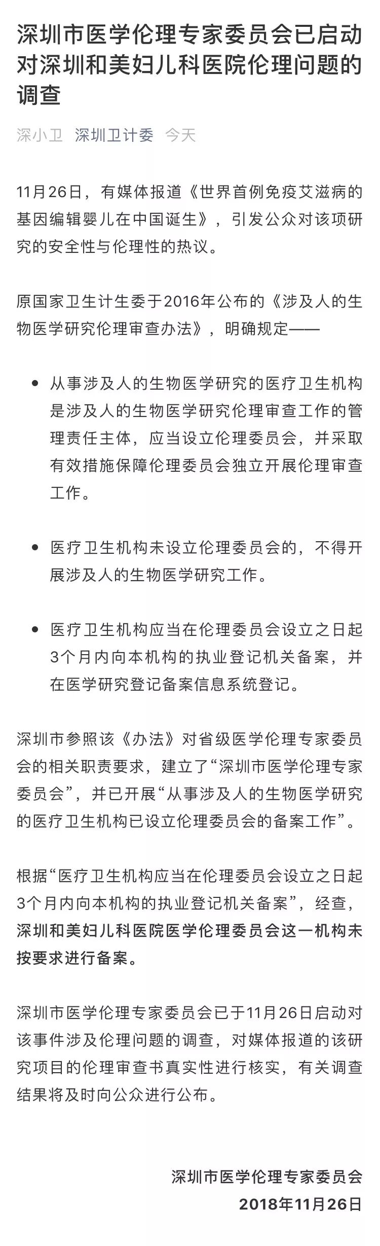 新闻稿称:“这对双胞胎的一个基因经过修改,使她们出生后即能天然抵抗艾滋病。这是世界首例免疫艾滋病的基因编辑婴儿,也意味着中国在基因编辑技术用于疾病预防领域实现历史性突破。”