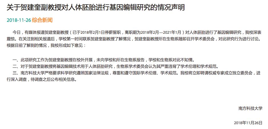 当日晚些时候,贺建奎本人也发布了一个视频回应质疑,他说:“基因编辑只是想帮助致命遗传病家庭,这些父母眼睁睁地看着孩子饱受遗传疾病的痛苦。”同时他还特别指出,“我拒绝基因增强、性别选择或者改变皮肤眼睛的颜色,因为这些不能算是对孩子真正的爱”。