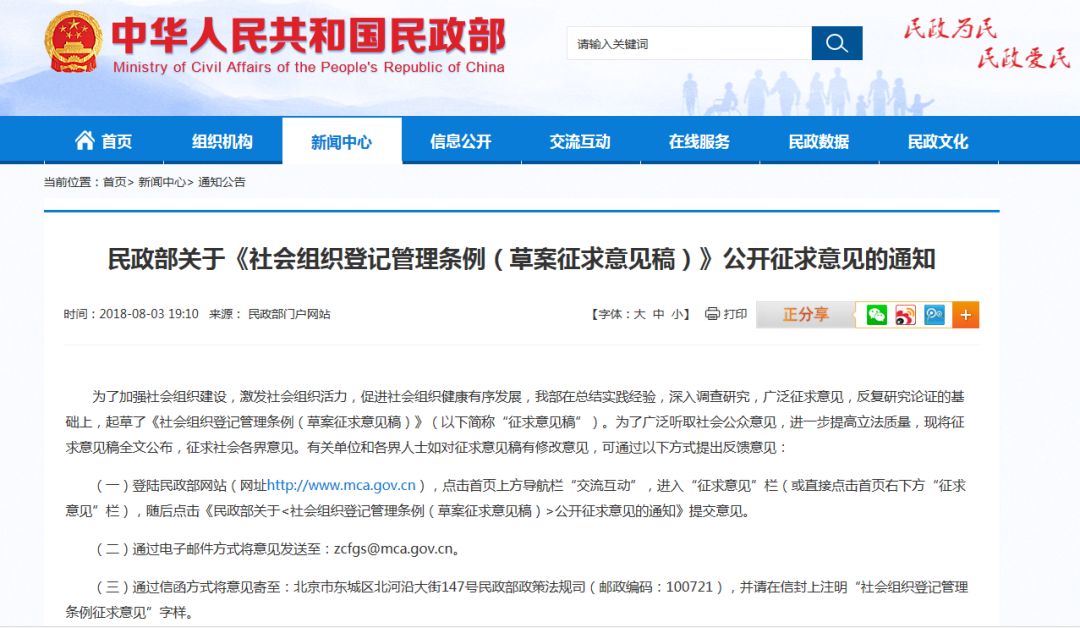 8月3日晚间,民政部发布通知就《社会组织登记管理条例(草案征求意见稿)》向社会各界征求意见。意见反馈截止时间为2018年9月1日。