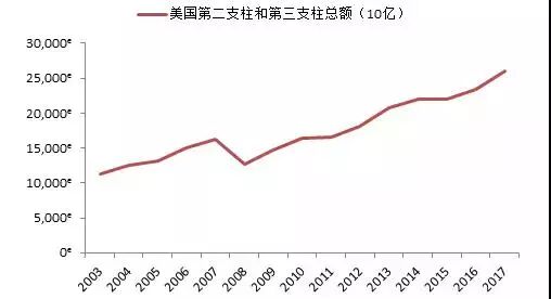 2016年,美国社会保障资金余额为2.85万亿美元,仅占三大支柱的11%左右。美国社会保障资金只能投资非上市流通的政府债券,长期收益水平在3%-4%之间。
