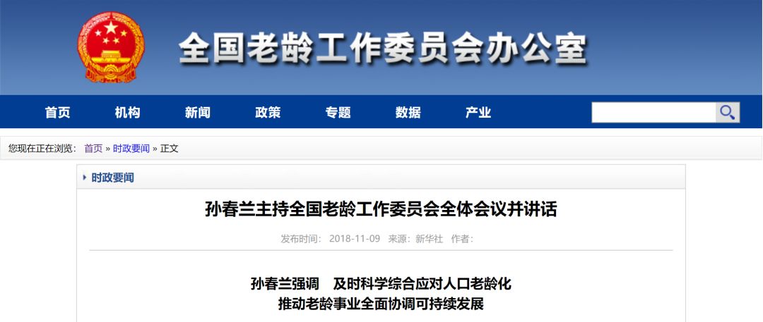 孙春兰指出,习近平总书记对我国人口老龄化问题高度重视,就老龄工作发表一系列重要论述,明确了老龄事业的发展方向和任务要求,要认真贯彻落实到位,惠及更多老年人。要按照“总揽全局、积极应对,人人尽责、人人享有,尽力而为、量力而行,创新引领、开放合作”原则,加强顶层设计,深化改革创新,完善相关政策,统筹推进“健康服务、养老服务、社会保障”体系建设,为平稳渡过人口老龄化高峰期创造良好条件。要贯彻大卫生大健康理念,推动医养资源打通使用,积极推进健康老龄化。要弘扬尊老敬老爱老传统,树立积极的老龄观,通过“银龄行动”等充分发挥老年人作用,大力发展老龄产业,切实维护老年人合法权益。
