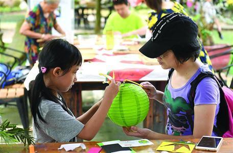 广西南宁,小朋友体验灯笼制作。 图/新华社