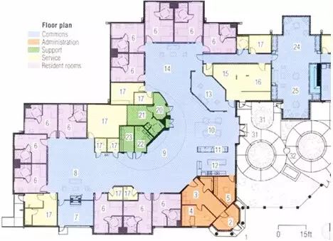 美国对失智老人以独立式失智养老机构和组合式养老机构为主要类型。其护理机构在居住单元、公共服务区、花园和后勤办公服务区这四个功能区有以下设计要点需要注意: