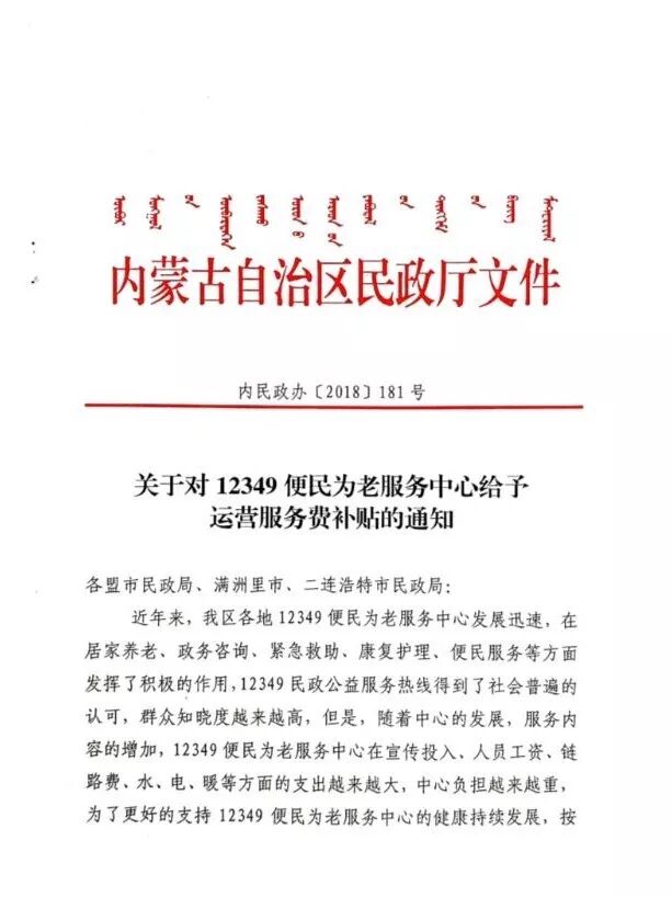附件:关于《关于对12349便民为老服务中心给予运营服务费补贴的通知》(内民政办{2018}181号)