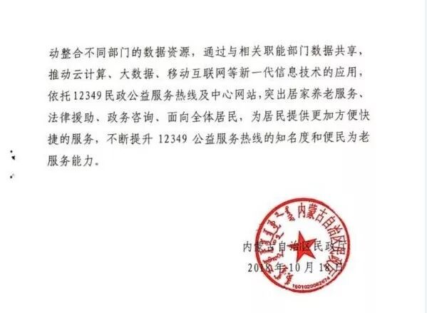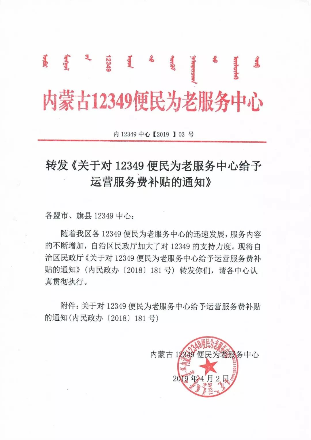 随着我区各地12349便民为老服务中心发展迅速,服务内容不断增加,自治区民政厅加大了对12349的支持力度。先将自治区民政厅《关于对12349便民为老服务中心给予运营服务费补贴的通知》(内民政办{2018}181号)转发你们,请各中心认真贯彻执行。