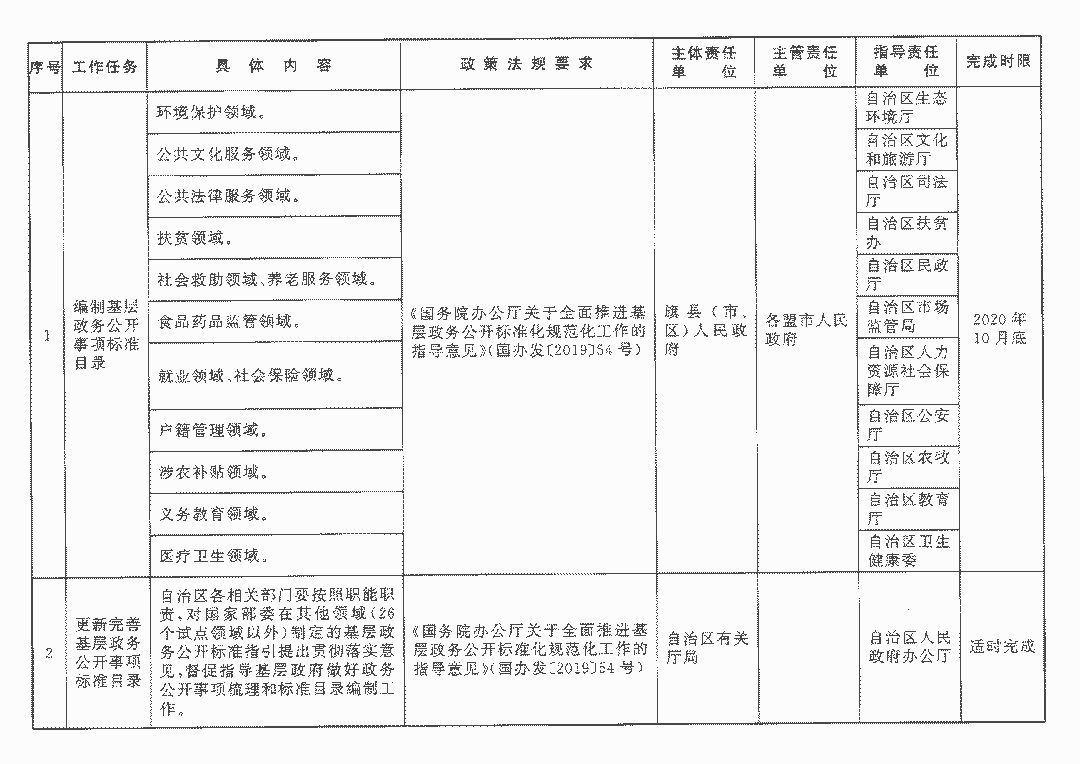(一)编制基层政务公开事项标准目录。基层政府(包括旗县级人民政府和苏木乡镇人民政府、街道办事处)要对照国务院有关部门印发的26个试点领域标准指引及有关要求,结合本级政府权责清单、公共服务事项清单等,全面梳理细化26个试点领域政务公开事项,除有法律、法规、规章等明确规定不予公开的,其余均应列入公开事项。基层政府应于2020年10月底前编制完成包括公开事项名称、内容、依据、时限、主体、渠道、公开对象和方式等要素的本级政府政务公开事项标准目录,作为本地区开展政务公开工作的基本遵循。