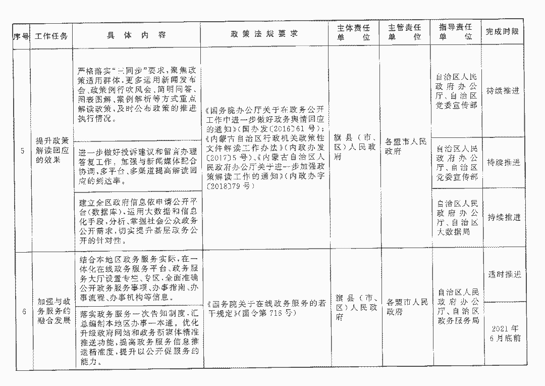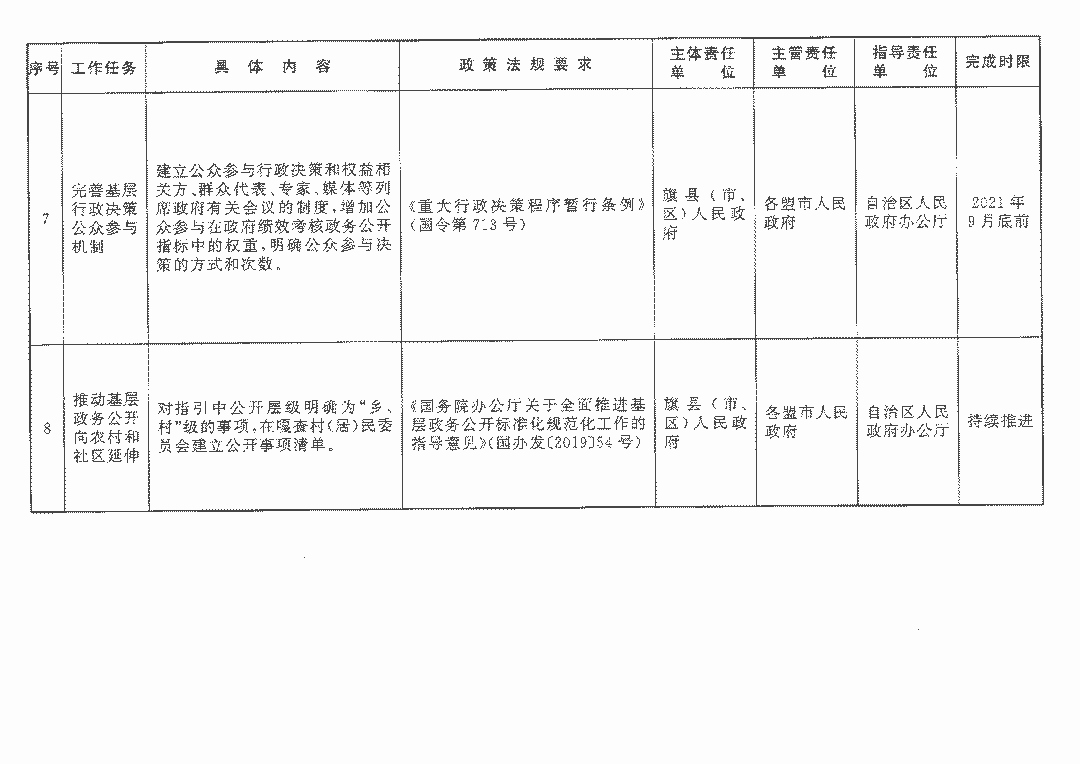 (一)建立基层政务公开工作规范。基层政府要严格落实国家和自治区关于全面推进政务公开工作的要求,认真贯彻执行《政府信息公开条例》,制定完善本地区信息管理、信息发布、解读回应、依申请公开、公众参与、监督考核等方面的制度规范,于2021年3月底前在本地区政府信息公开平台向社会公开。同时,鼓励将政务公开事项标准目录及制度规范嵌入部门业务系统,并适时列入政府绩效考核政务公开指标体系,促进公开工作与其他业务工作融合发展。