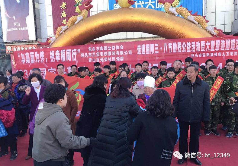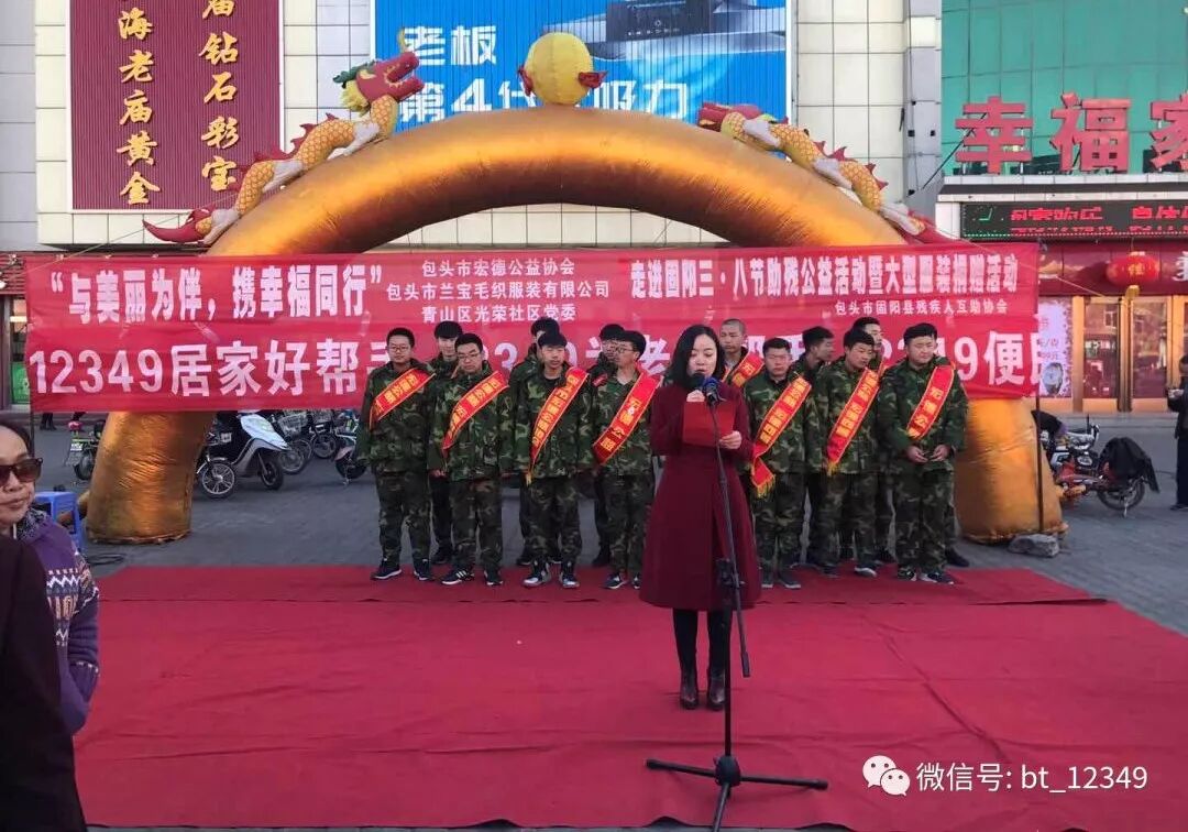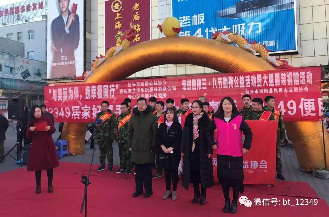 在3.8国际妇女节到来之际,包头市12349便民为老呼叫服务中心后台加盟商包头市宏德公益协会携手包头市12349便民为老呼叫服务中心、固阳残联、固阳县残疾人互助协会、包头市兰宝毛织服装有限公司、青山区光荣社区党委、在固阳县天河广场开展3.8妇女节助残服装捐赠公益活动。3.8妇女节是世界的传统妇女节日,也是广大残疾妇女的节日,为使固阳县的残疾妇女及困难家庭感受到国家和社会各阶层的关爱, 为了使固阳县残疾妇女们过上一个祥和快乐的节日,让其体现出独立、自信美丽的一面,同时促进固阳人民和谐有爱的大家庭氛围,极大的丰富了固阳县人民的业余精神文化生活,特举办此次关爱女性奉献爱心的公益捐赠活动。