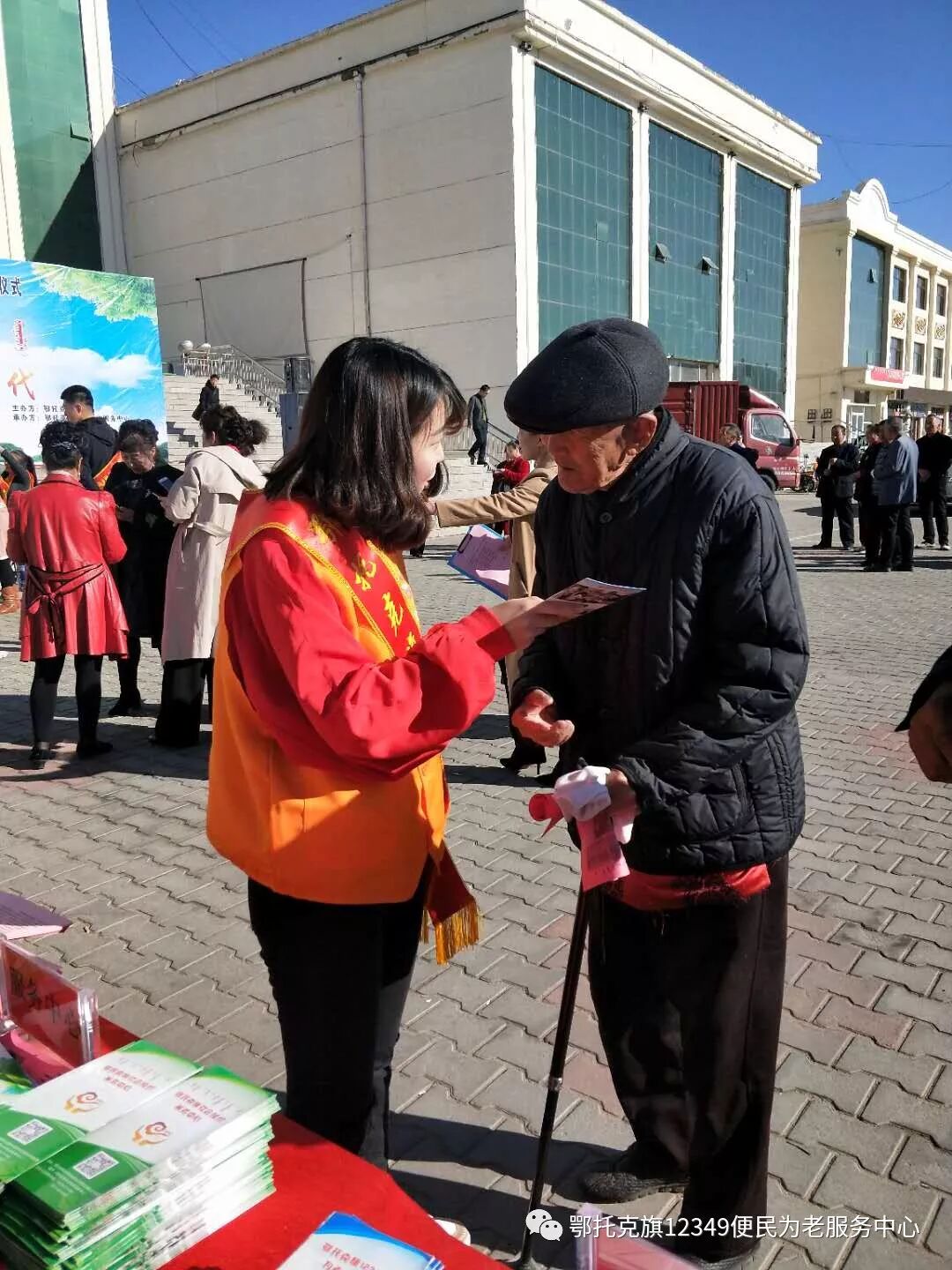 为到场老人发放宣传册