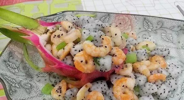 6、不需要太久,否则蔬菜会失去脆嫩感,快熟时放入食盐、鸡精调味,最后放上火龙果翻炒一下出锅装进火龙果壳内即可;