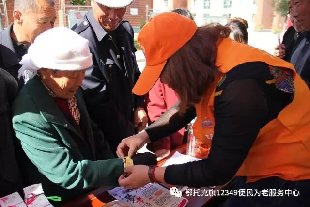 扶贫日,鄂托克旗12349便民为老服务中心来到木凯淖尔村为木凯淖尔镇全部老年人和贫困户进行了送爱心活动,免费发放了保温水杯和爱心黄手环。